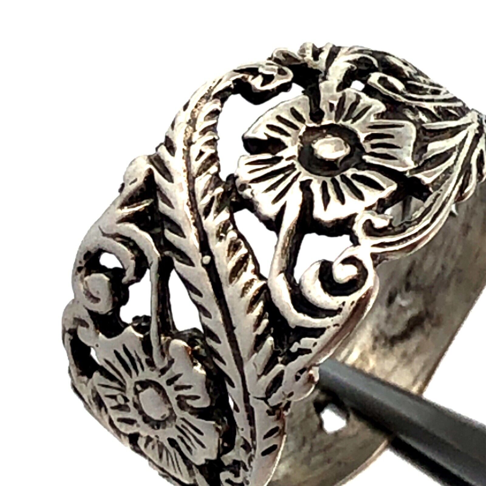 - Estate 925 Sterling Silver Floral Flower Vines Nature Open Work Wide Band Ring