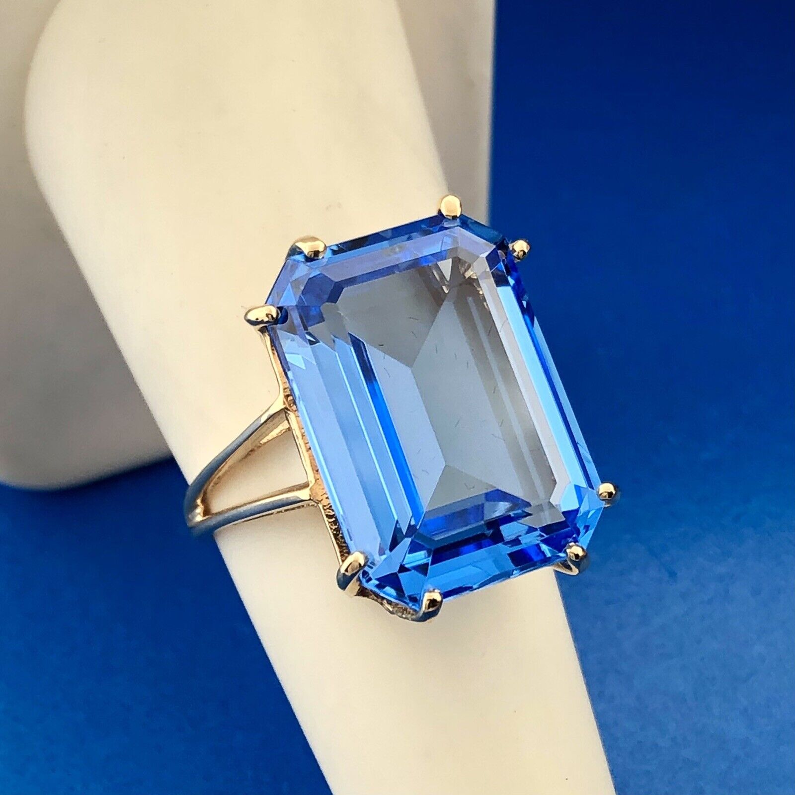 - Fabulous 14K Yellow Gold Emerald Cut Lab Blue Spinel Solitaire Statement Ring