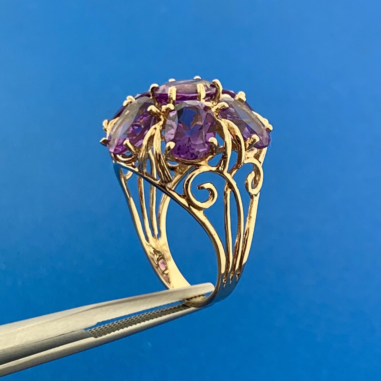 - Gorgeous 10k Yellow Gold Oval Cut Amethyst Cluster Openwork Dome Ring Size 7.75