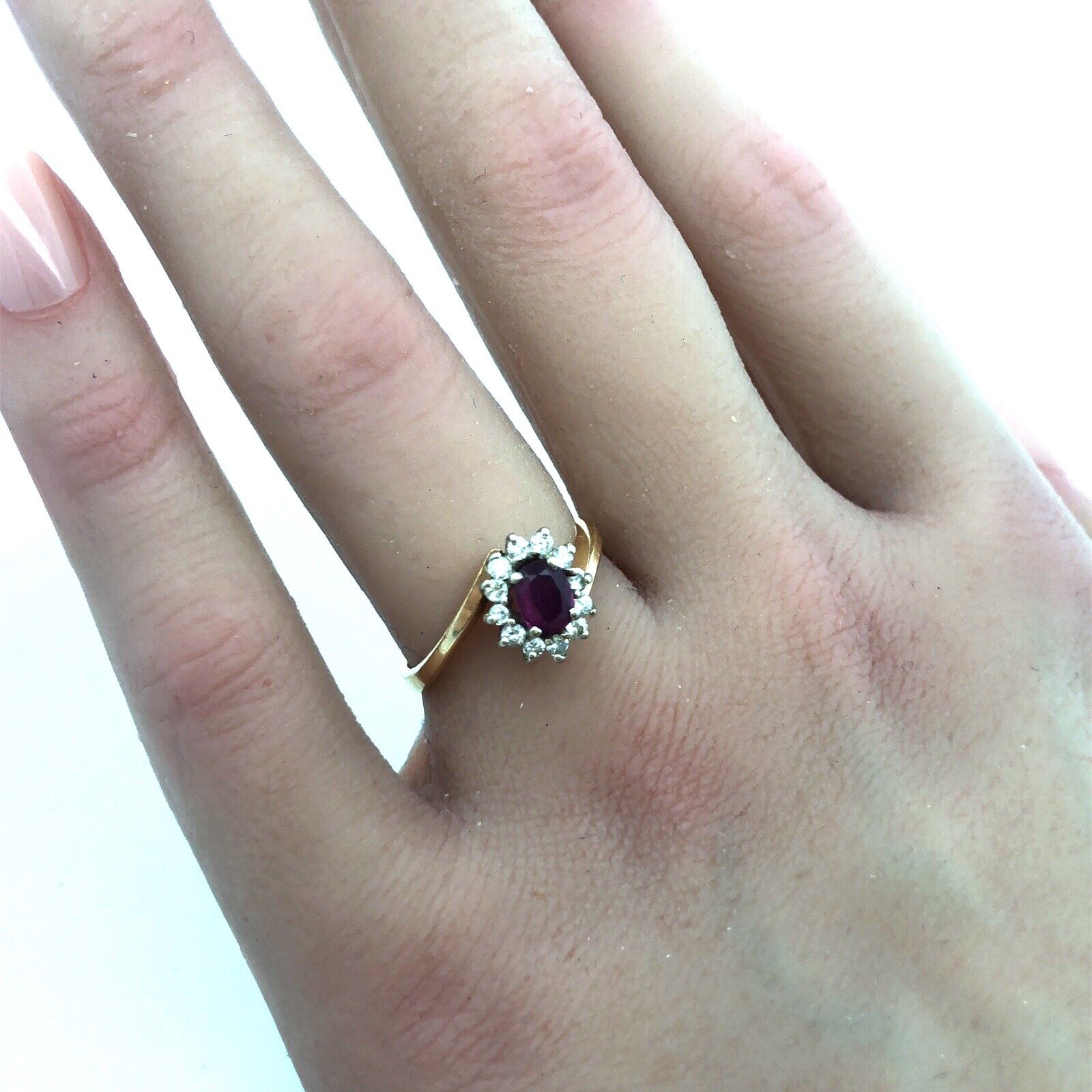 - Gorgeous 14k Yellow Gold Oval Cut Ruby Diamond Halo Twisted Band Ring Size 6.25