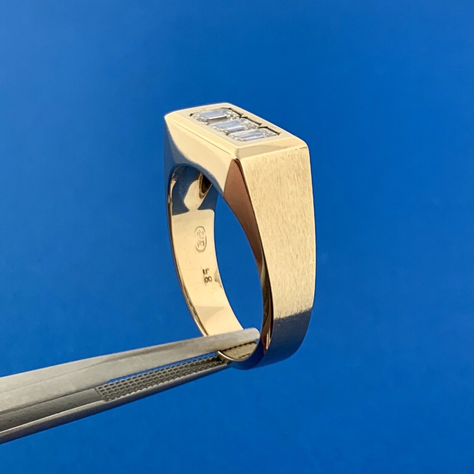- Gorgeous 14k Yellow Gold Radiant Cut Diamond Triple Set Channel Ring Size 9.5