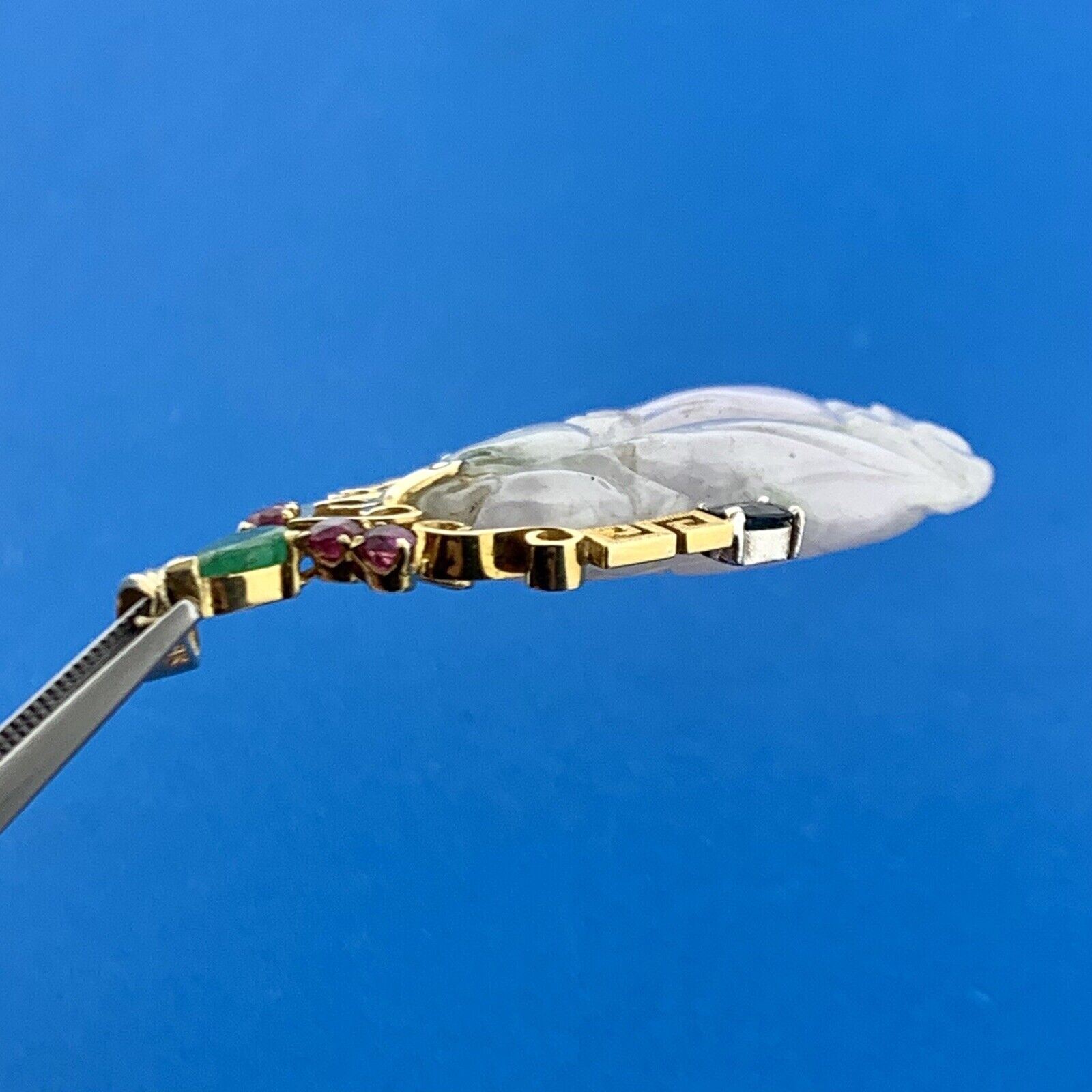- Stone(s): (1) Carved White Jade, (1) Pear Emerald, (4) Round Ruby, (2) Oval Sapphire