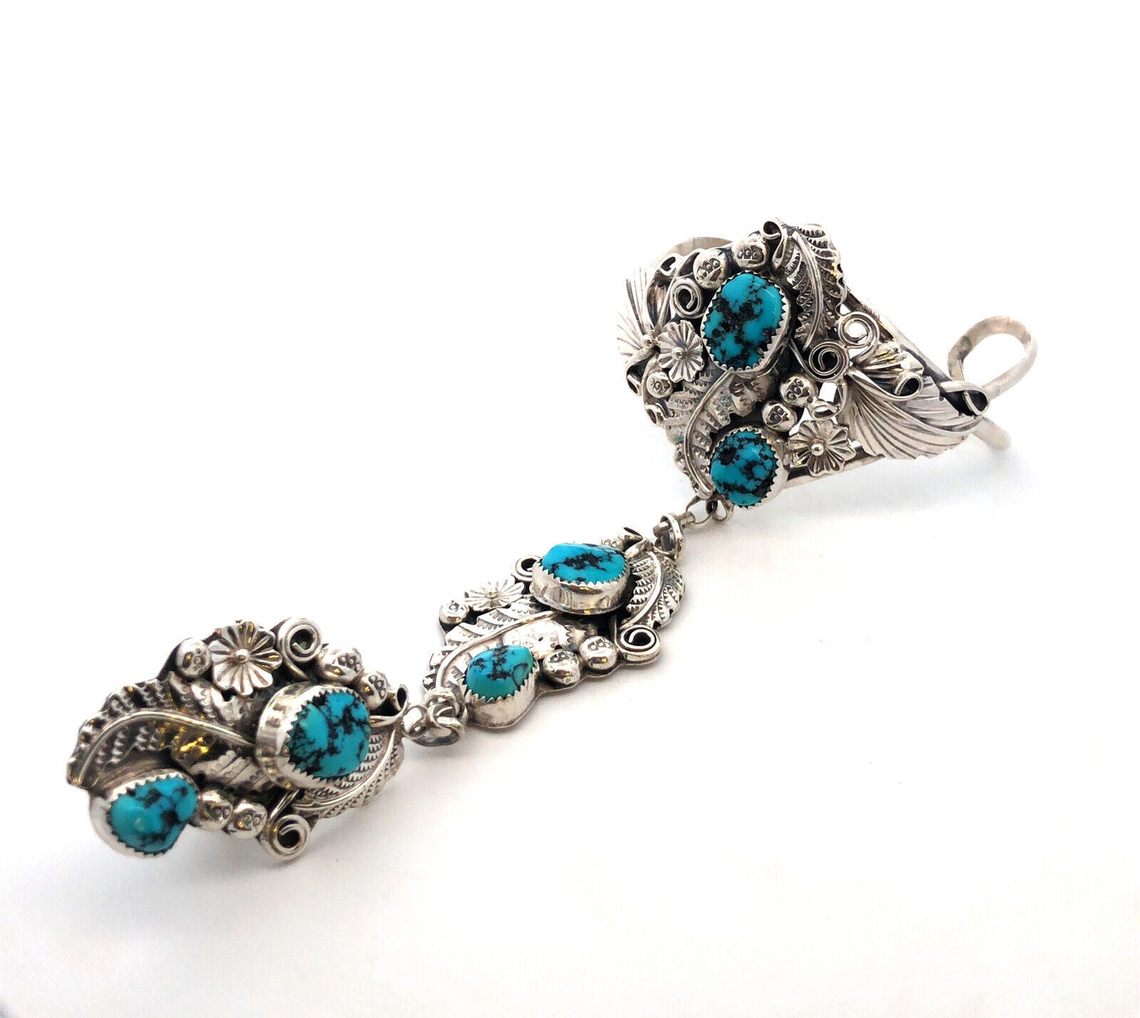 - Harry B Yazzie Navajo Sterling Silver Turquoise Squash Blossom Slave Bracelet
