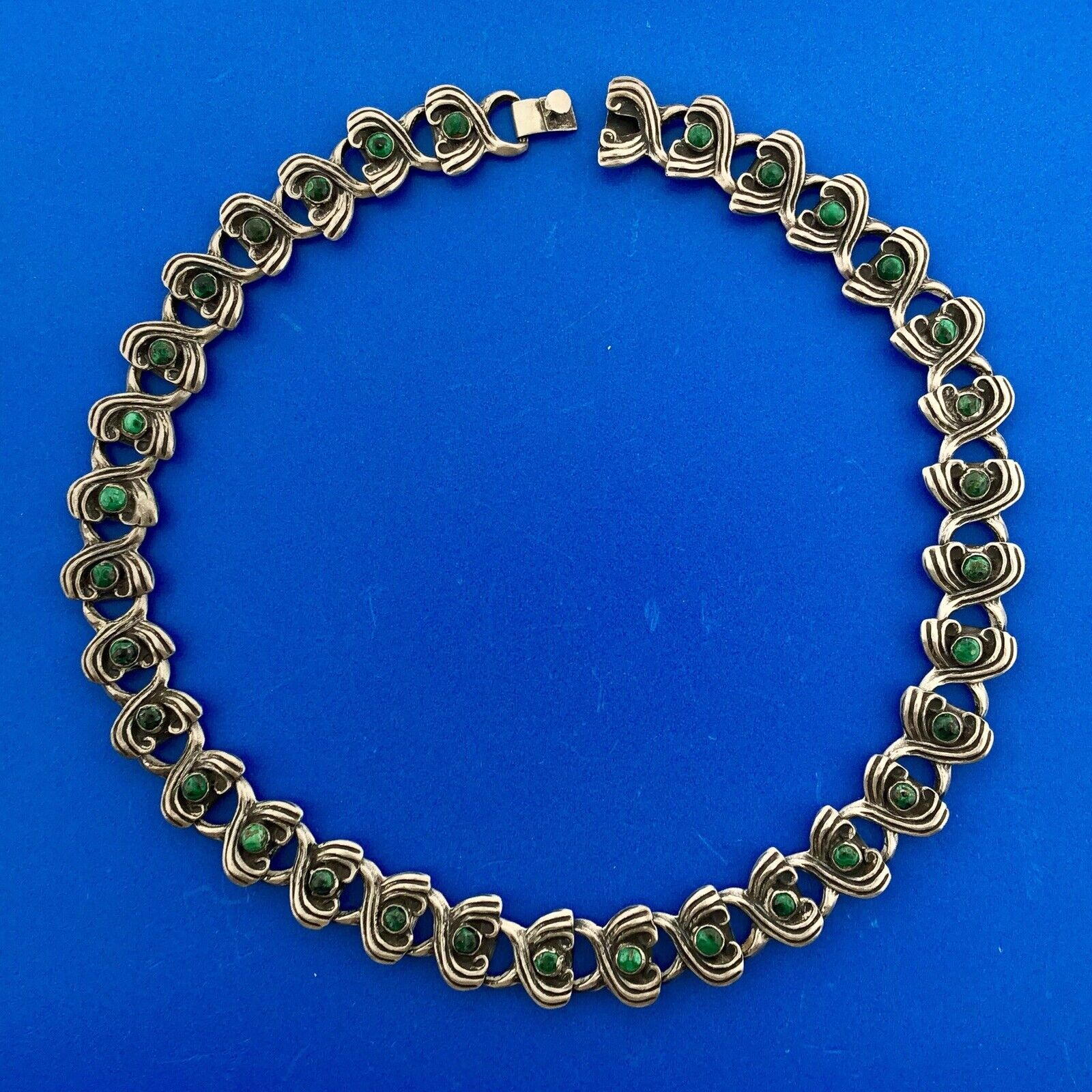 - Mid Century Taxco Mexico 925 Sterling Silver Malachite Scroll Panel Necklace