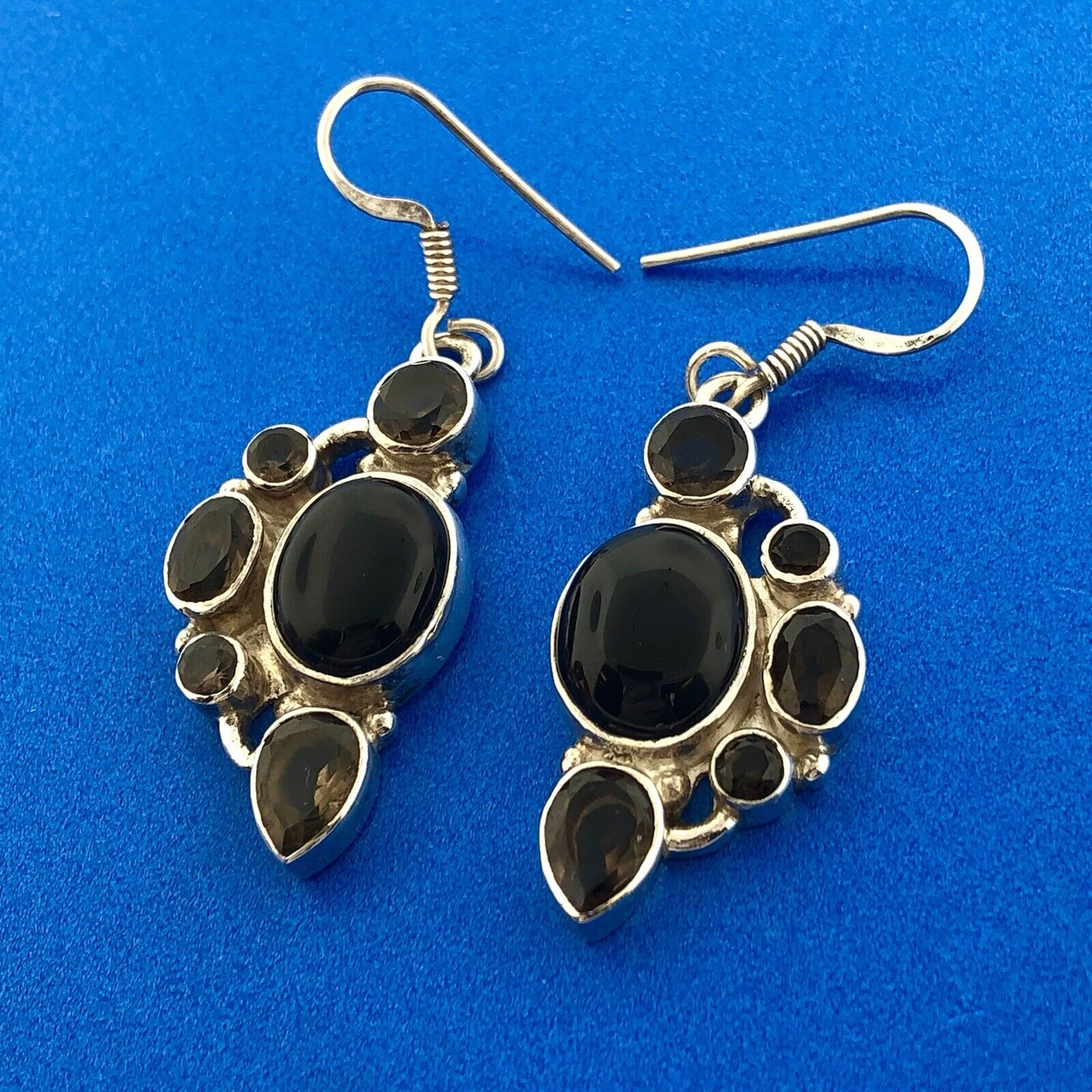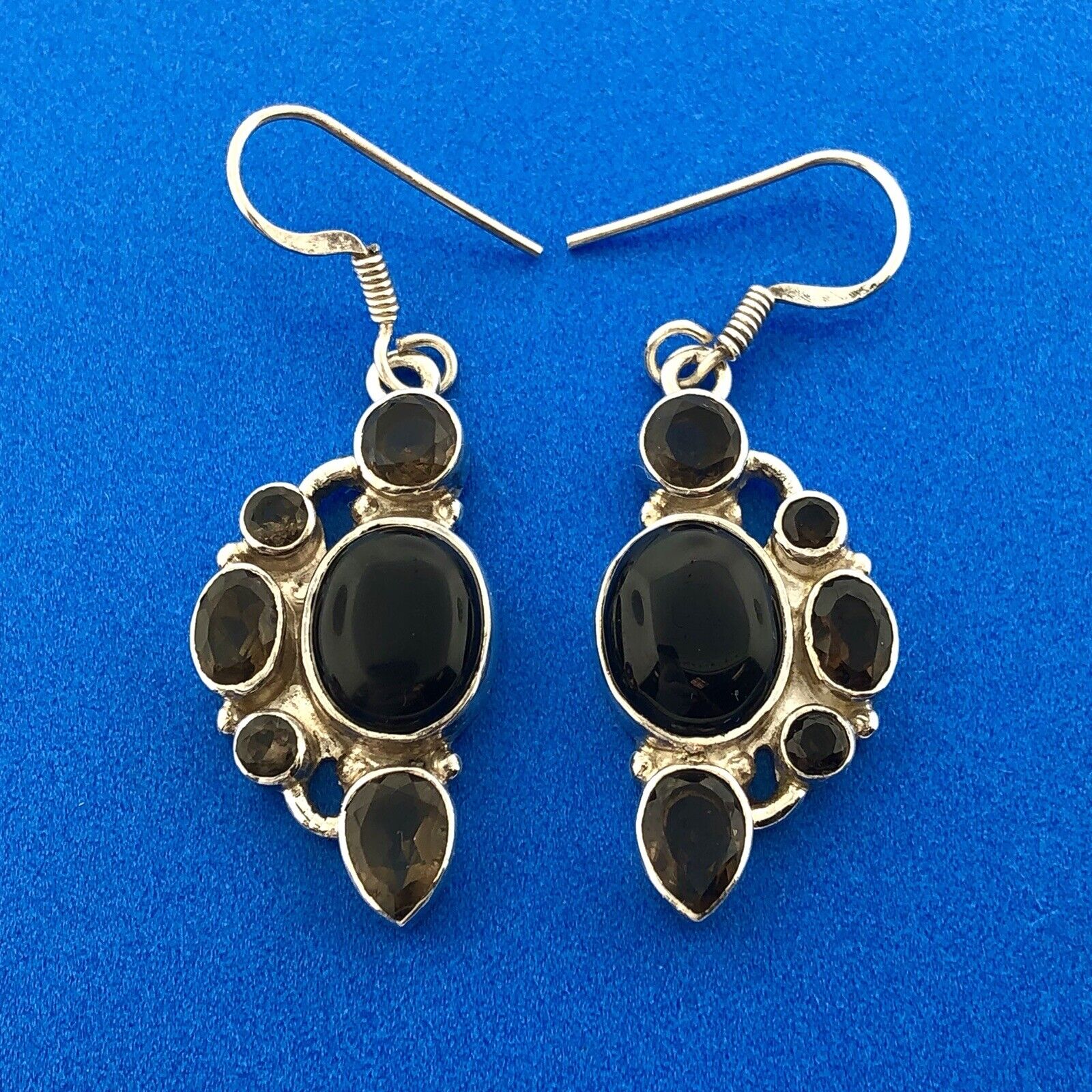 - Modernist 925 Sterling Silver Black Onyx Smoky Quartz Drop Dangle Earrings