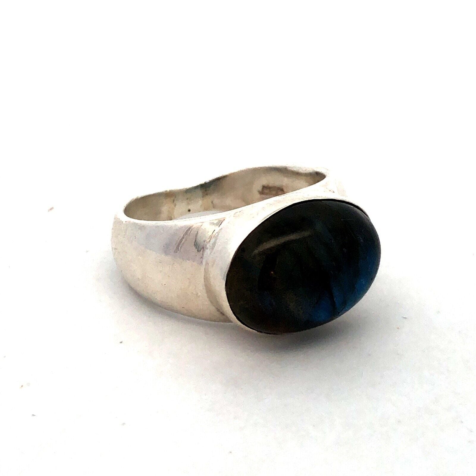 Modernist 925 Sterling Silver Oval Cabochon Labradorite Bezel Solitaire Ring