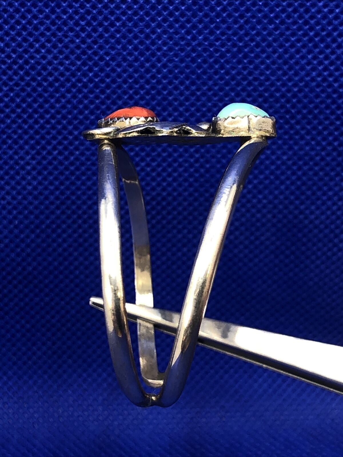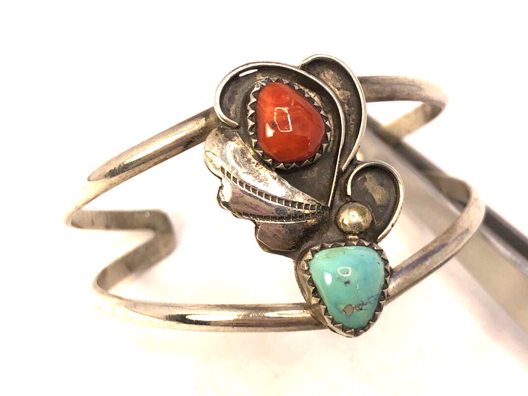 - Old Pawn 925 Sterling Silver Squash Blossom Turquoise & Coral Open Cuff Bracelet