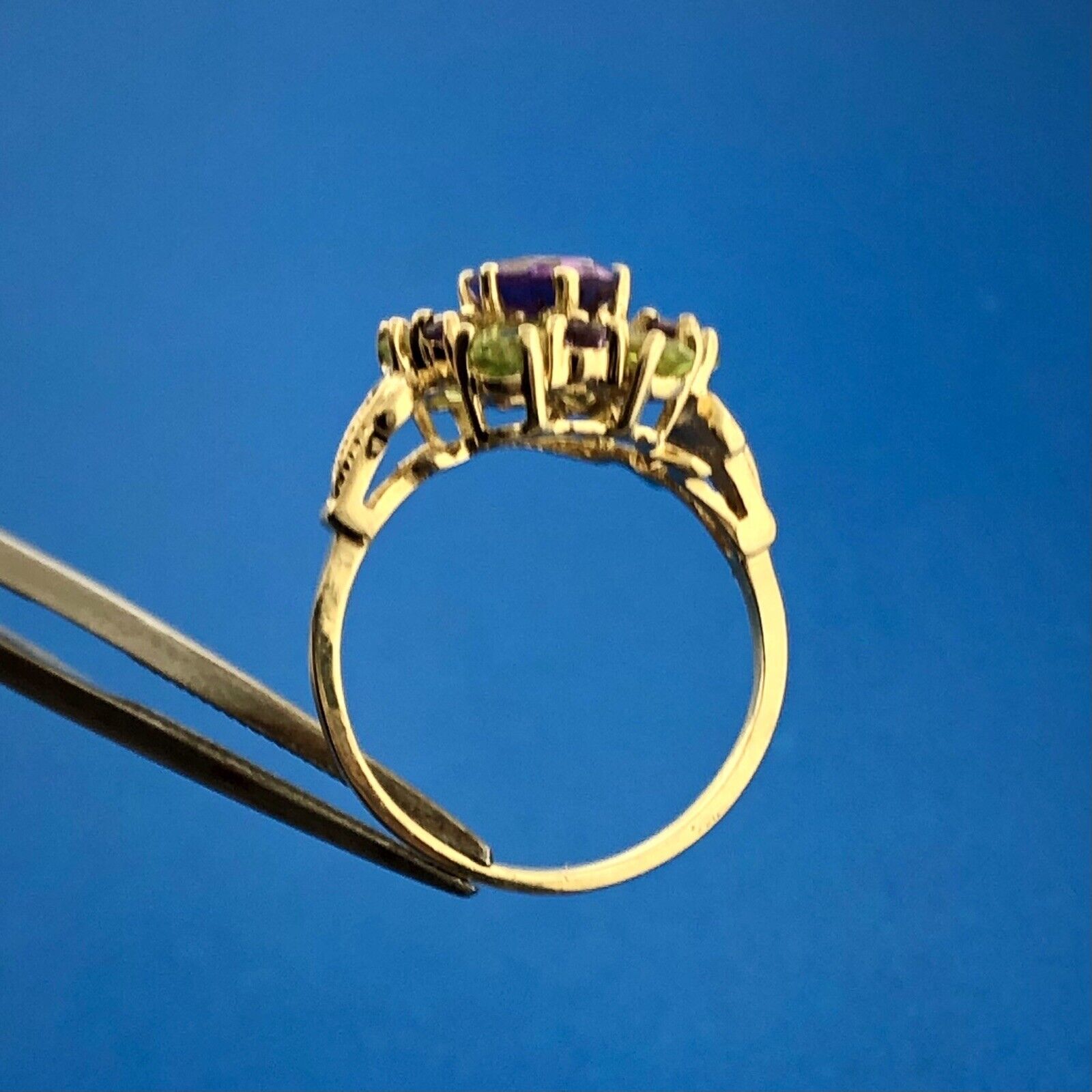 - Retro 10K Yellow Gold Peridot Amethyst Floral Flower Cluster Statement Ring