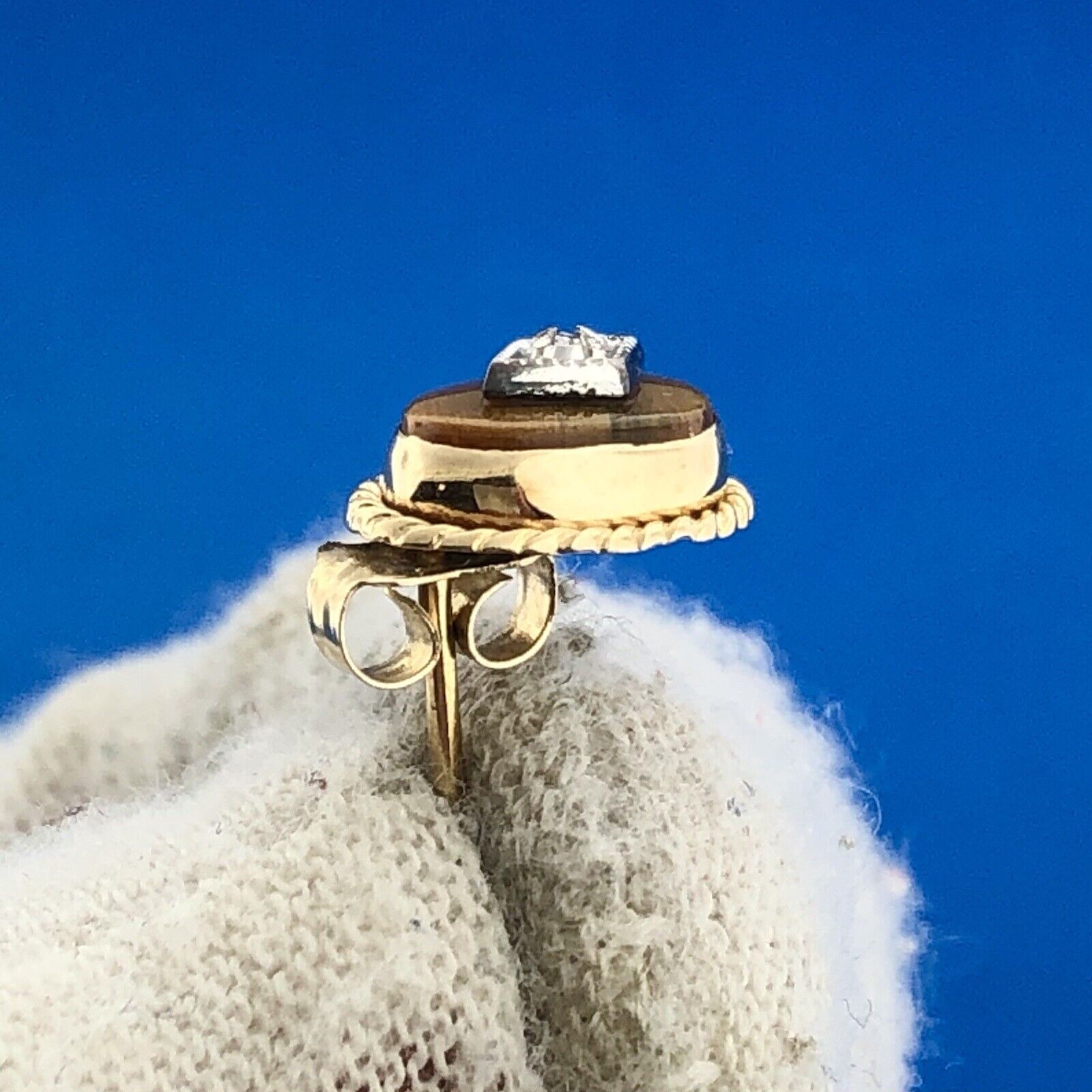- Retro 14K Yellow White Gold Oval Tiger Eye Cabochon Diamond Accent Stud Earrings