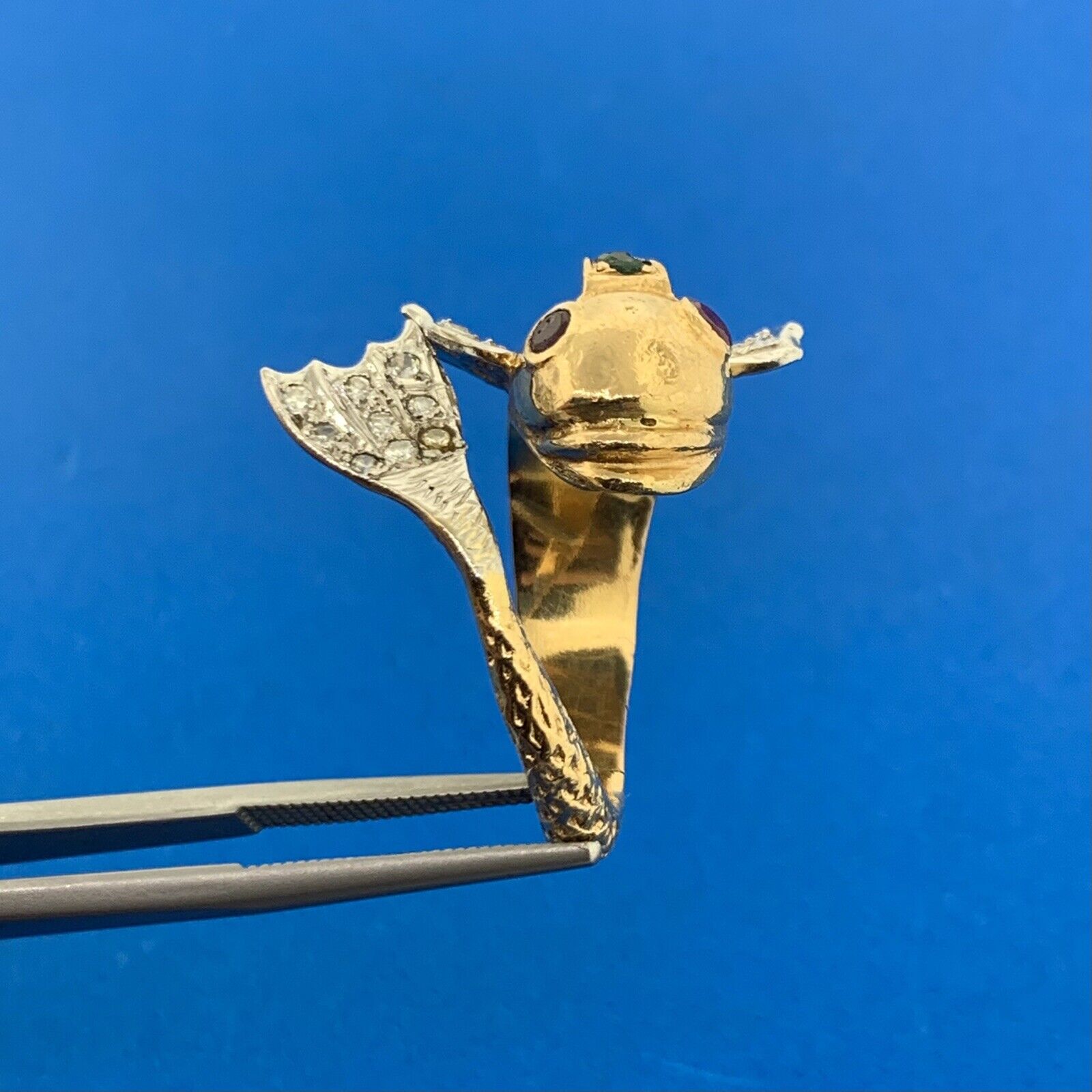 Retro 18K Yellow Wht Gold Diamond Ruby Emerald Textured Koi Fish Statement Ring