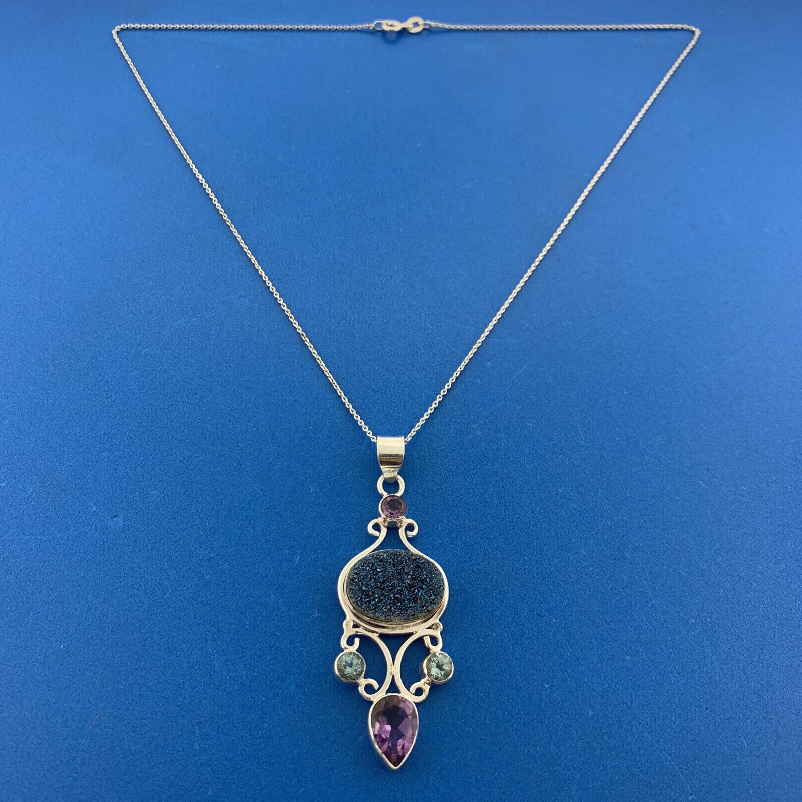 - Sterling Silver 925 Amethyst Blue Topaz Drusy Quartz Statement Pendant Necklace