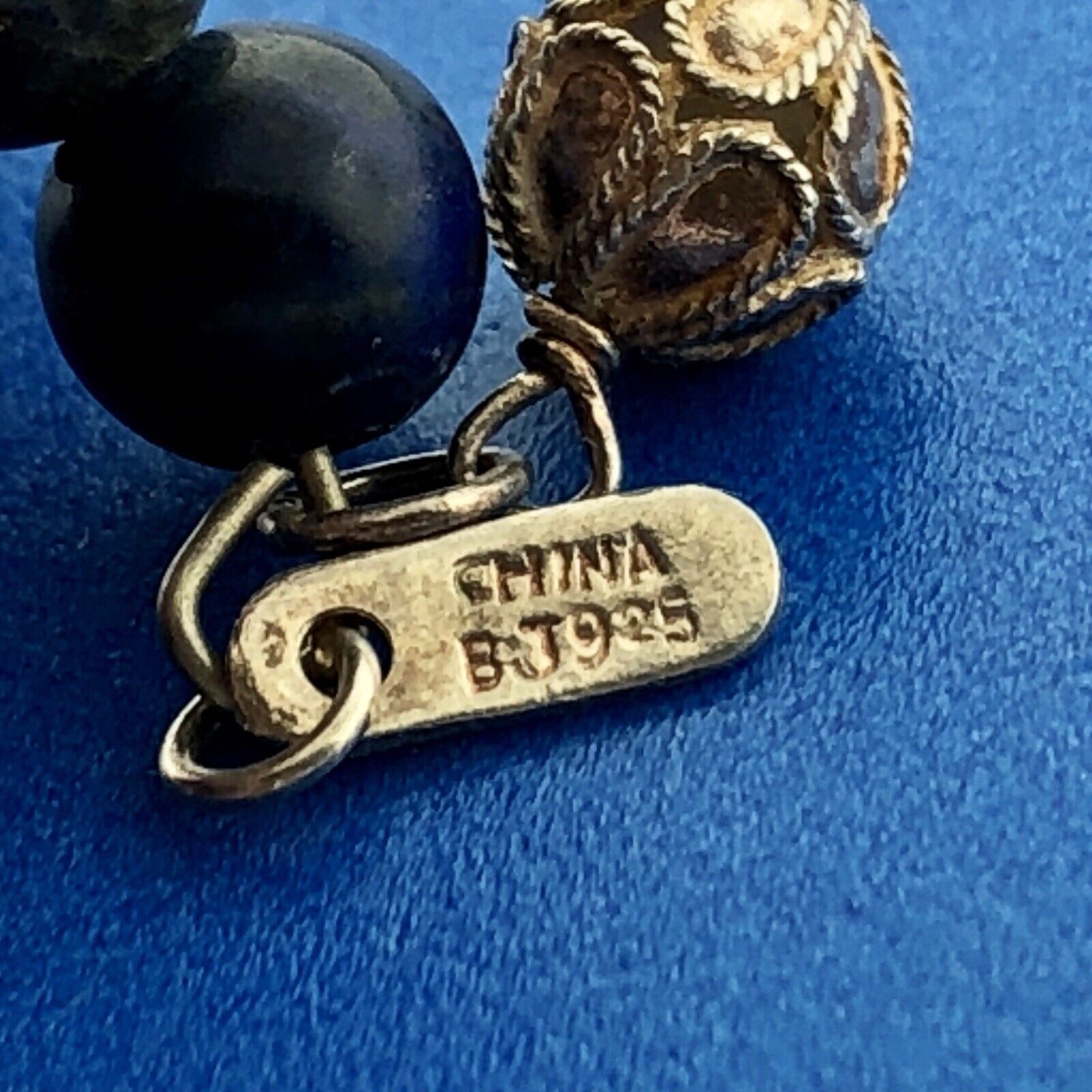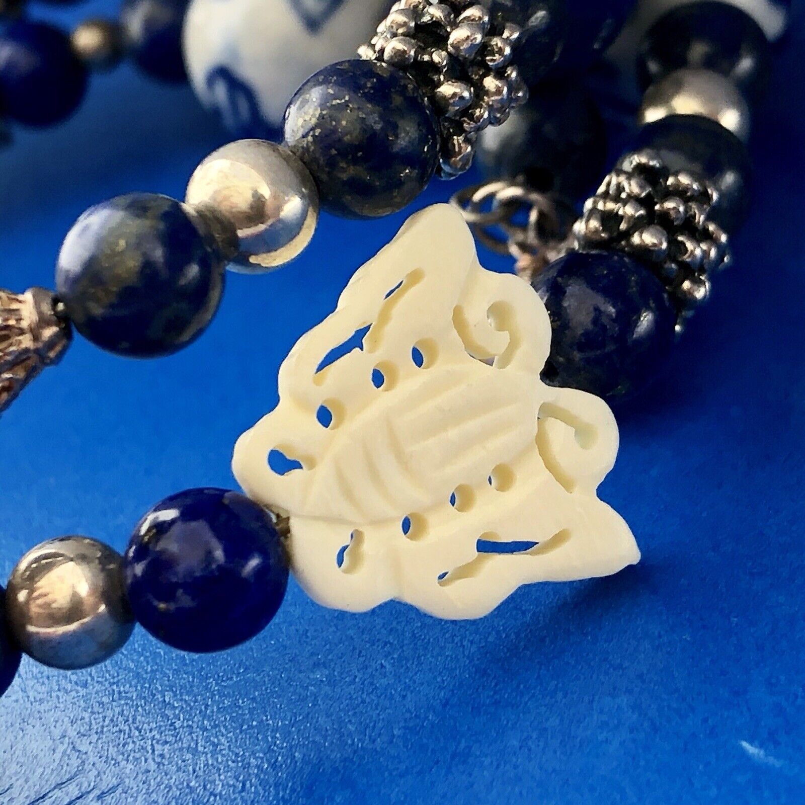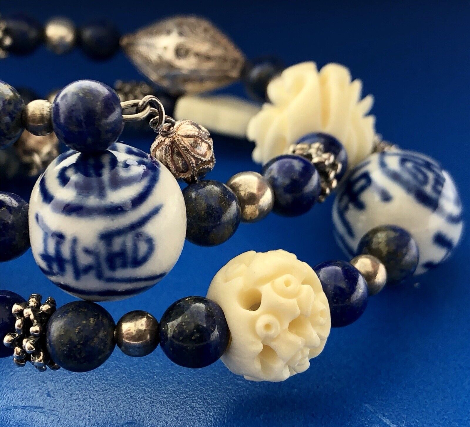 - Sterling Silver 925 Lapis Ceramic Carved Bone Cloisonne Bead Three Wrap Bracelet