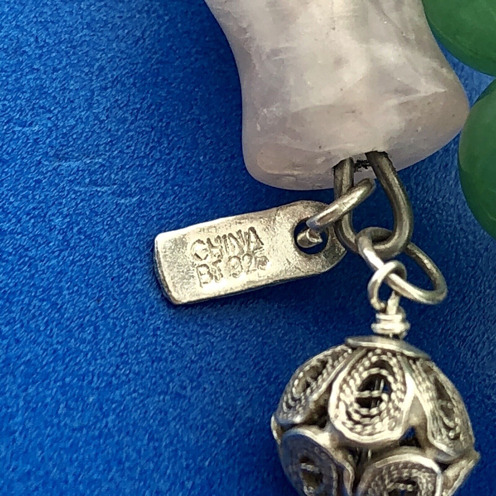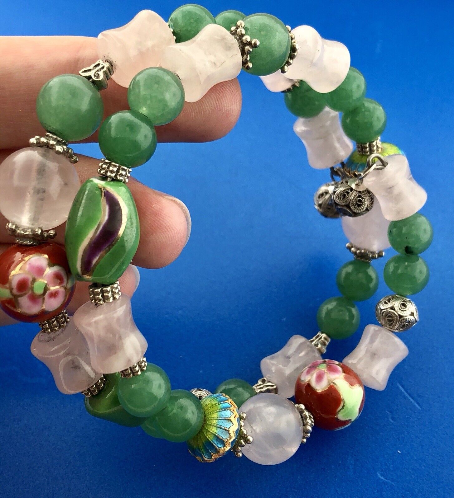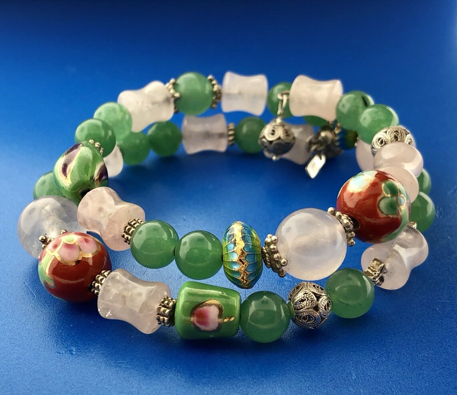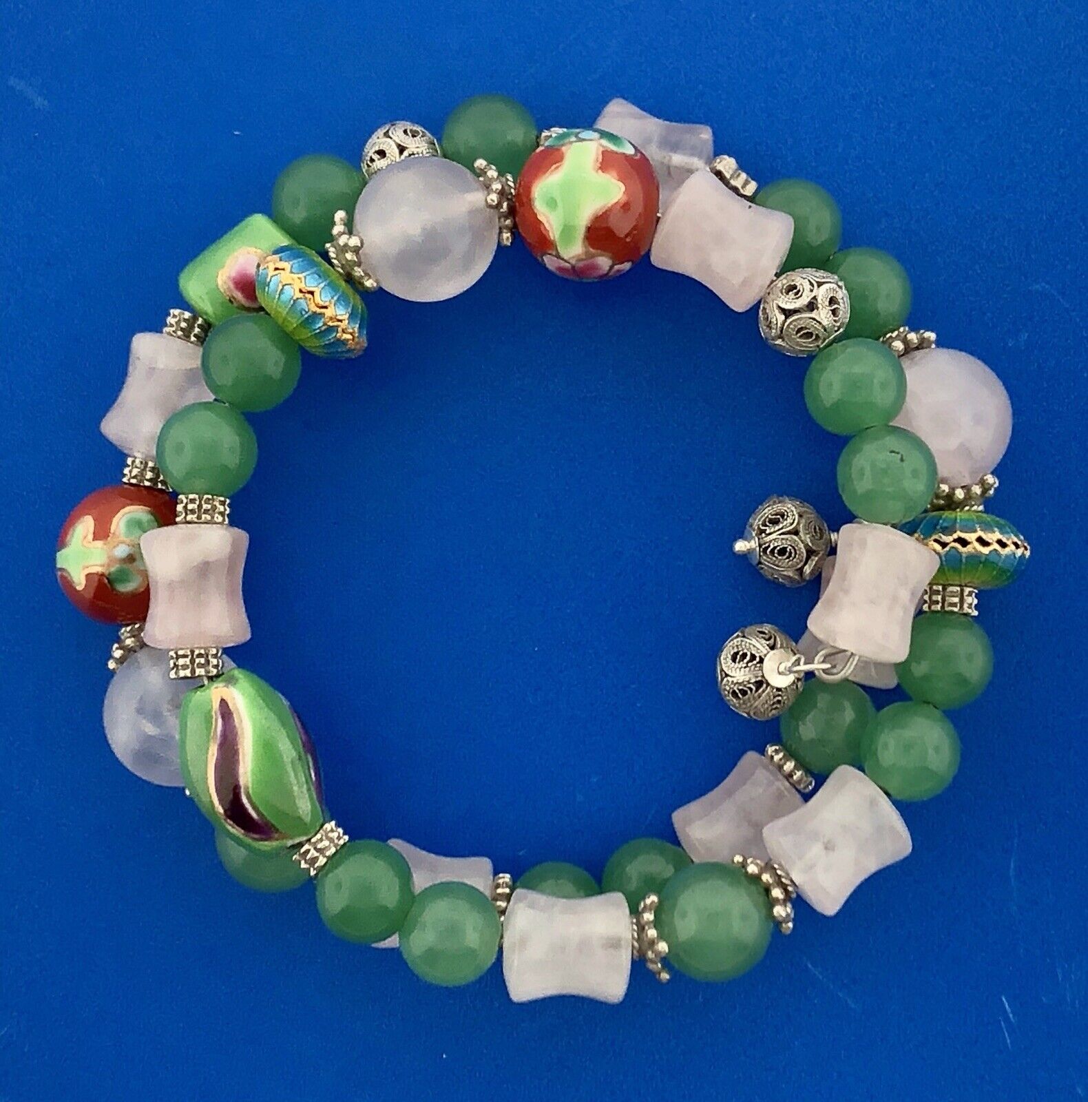 - Sterling Silver Green Lavender Jade Ceramic Cloisonne Bead Three Wrap Bracelet