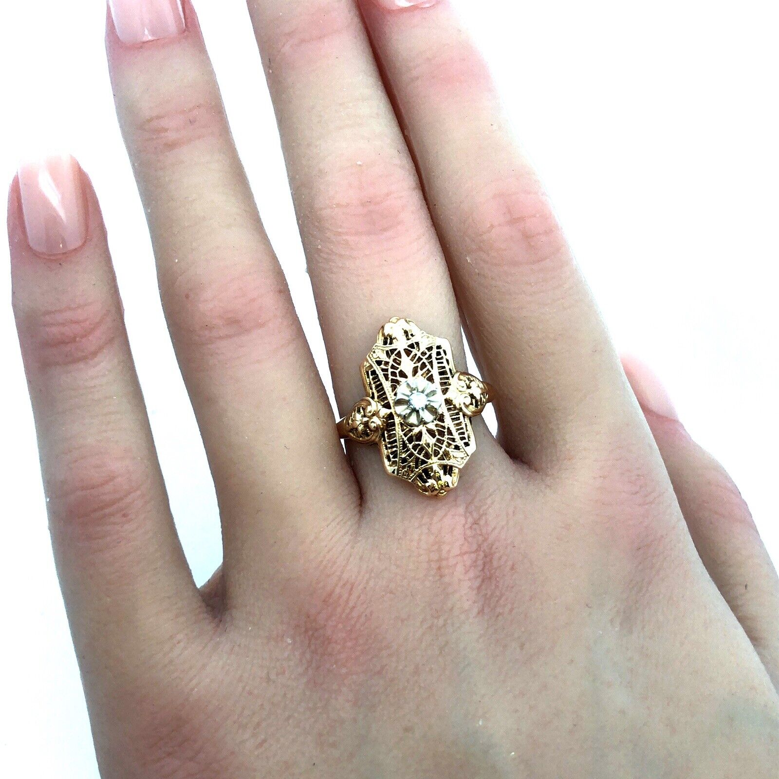 - Vintage 10K Yellow Gold Diamond Floral Filigree Statement Finger Ring