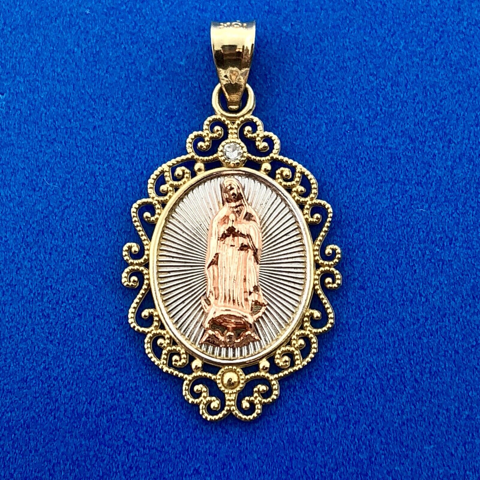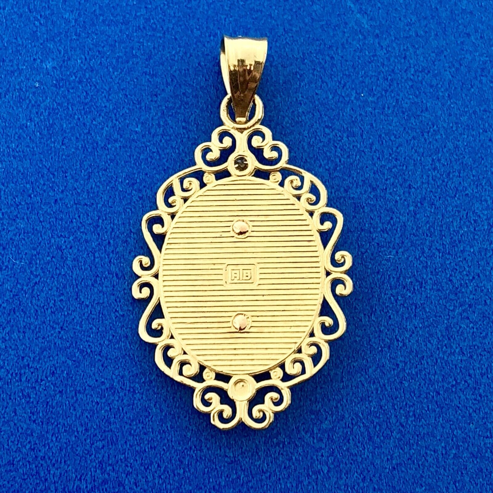 - Vintage 10K Yellow White Rose Gold Diamond Oval Filigree Mother Mary Pendant