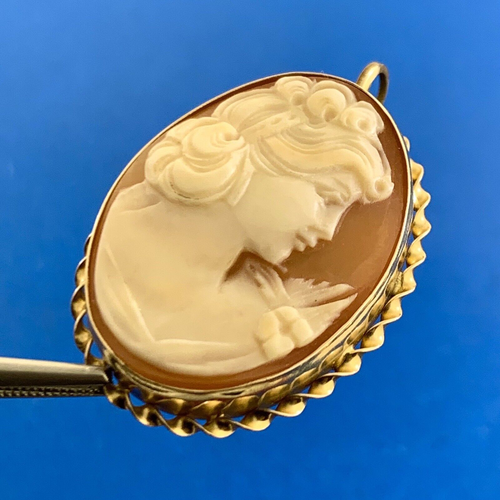 - Vintage 14K Yellow Gold Carved Cameo Oval Ribbed Statement Pendant