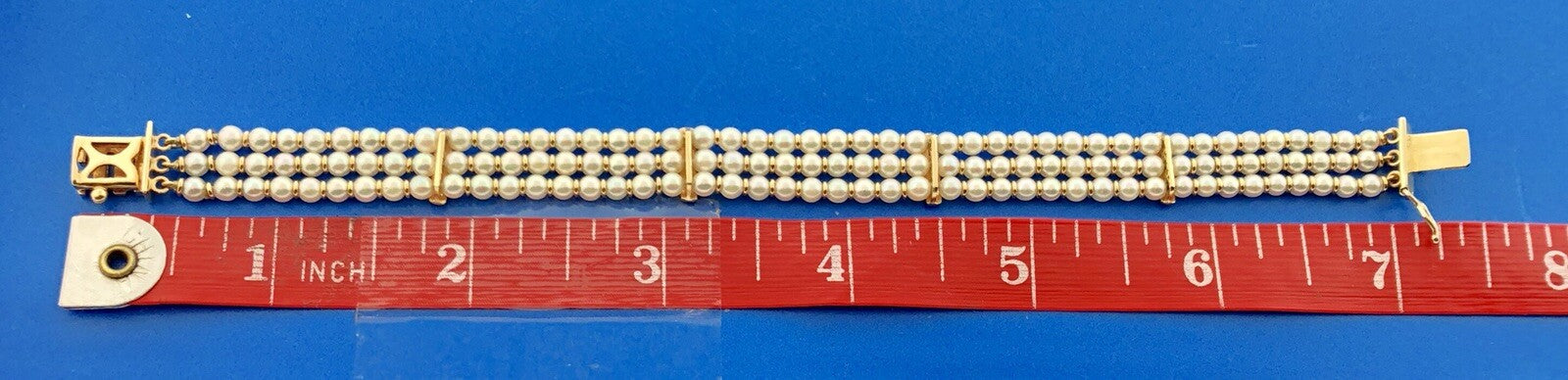 - Vintage 14K Yellow Gold Cultured Pearl 3 Strand Bridal June Anniversary Bracelet