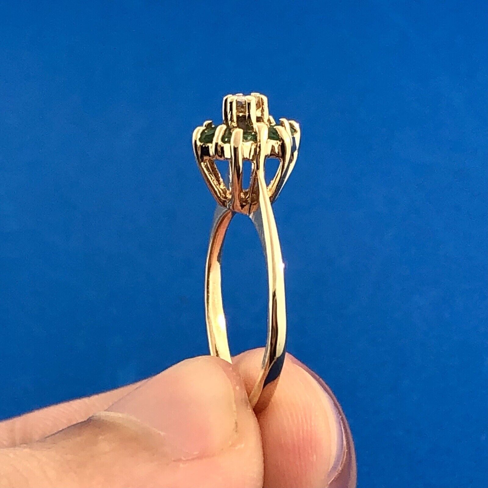 - Vintage 14K Yellow Gold Designer Emerald Diamond Cluster May Anniversary Ring