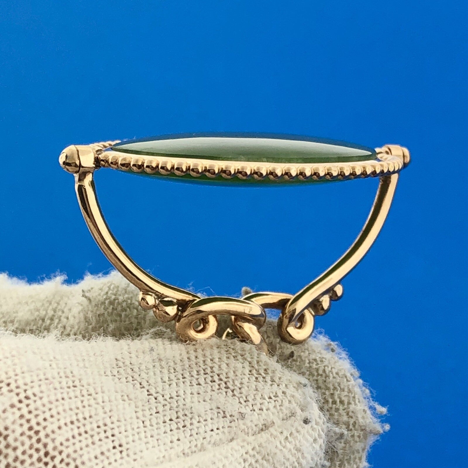 - Vintage 14K Yellow Gold Green Jade Oval Scroll Bead Work Statement Pendant