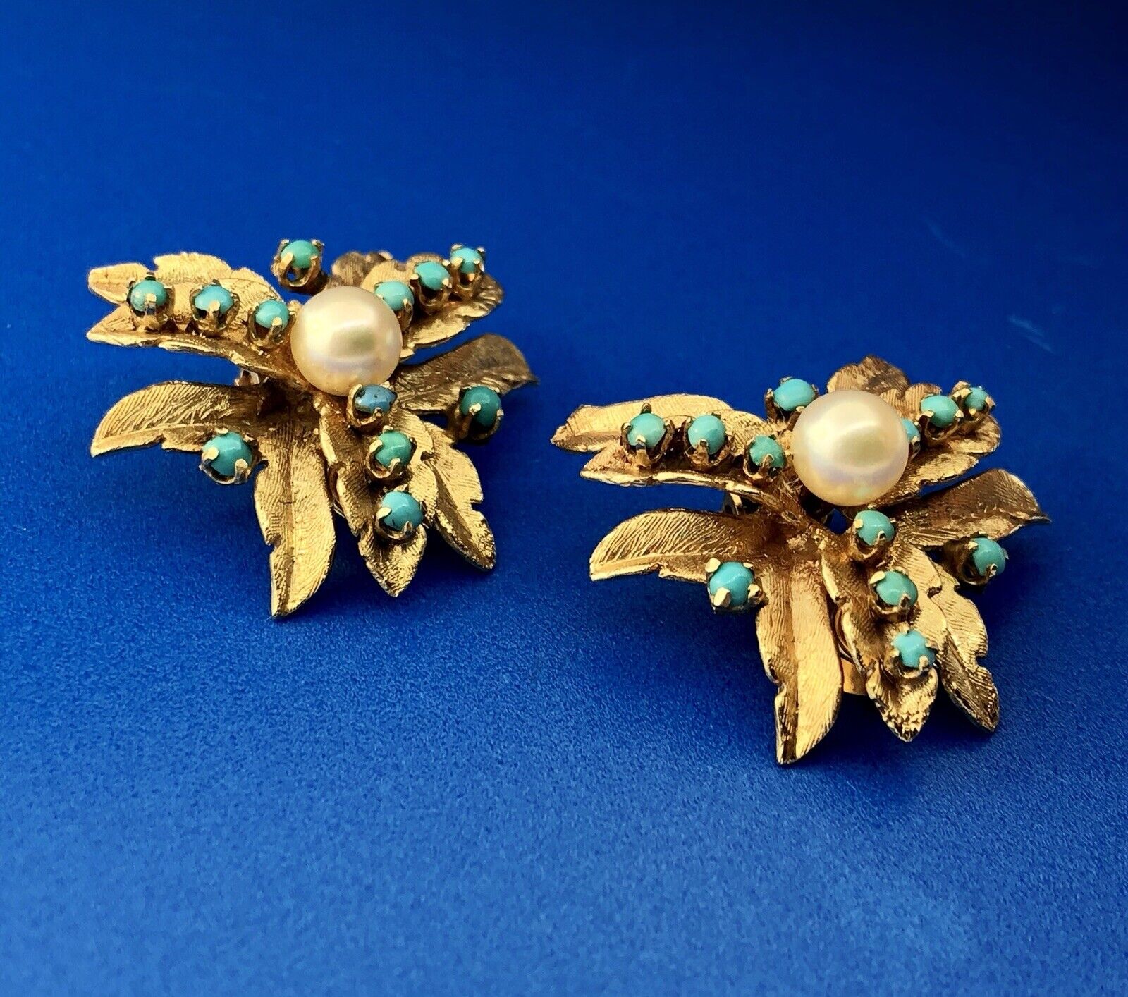 - Vintage 14K Yellow Gold Pearl Turquoise Leaf Design Statement Clip Earrings