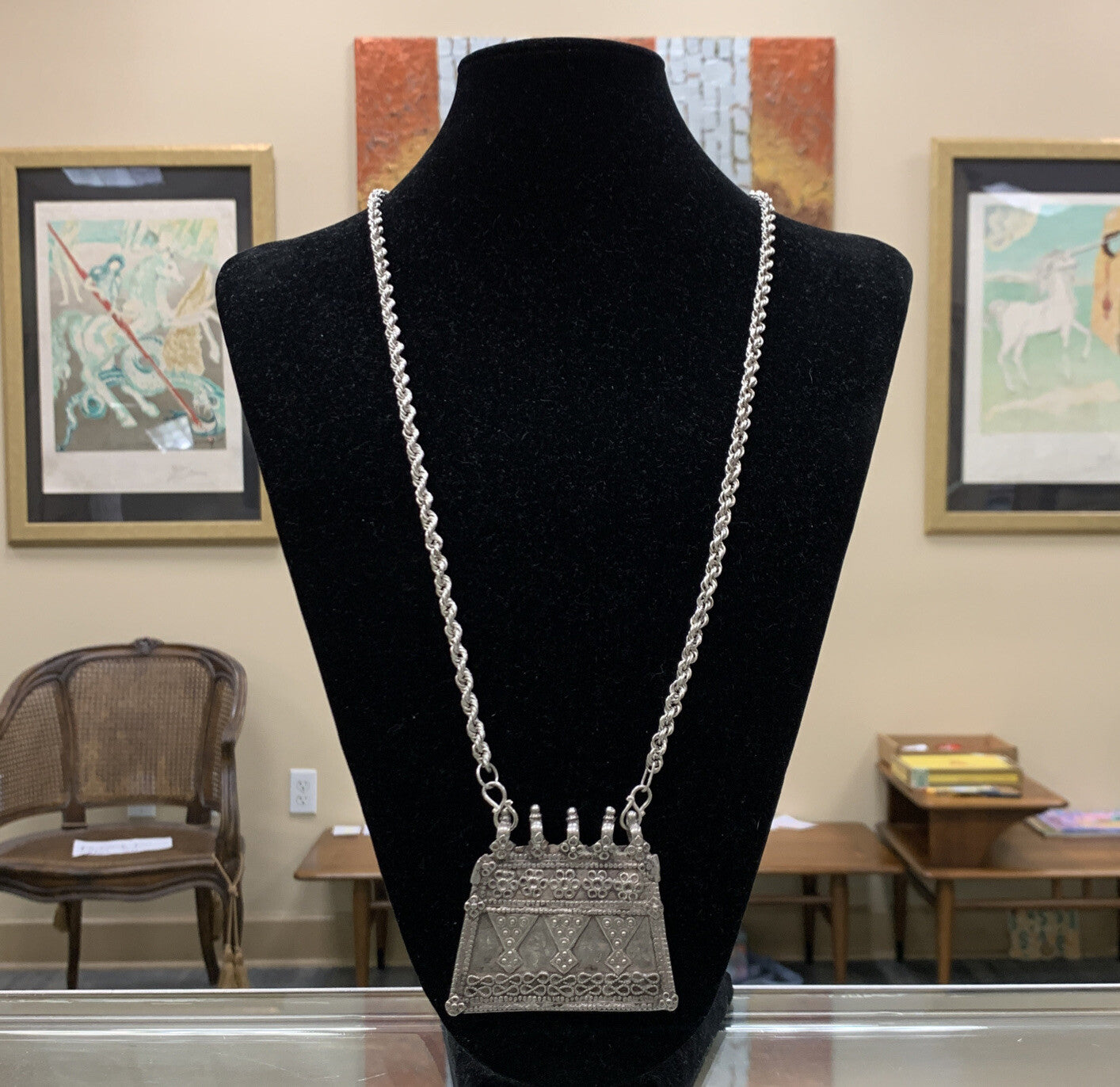 - Vintage 925 Sterling Silver Artisan Floral Etched Heavy Pendant Statement Necklace