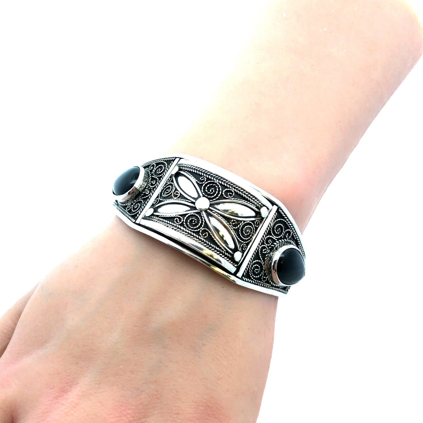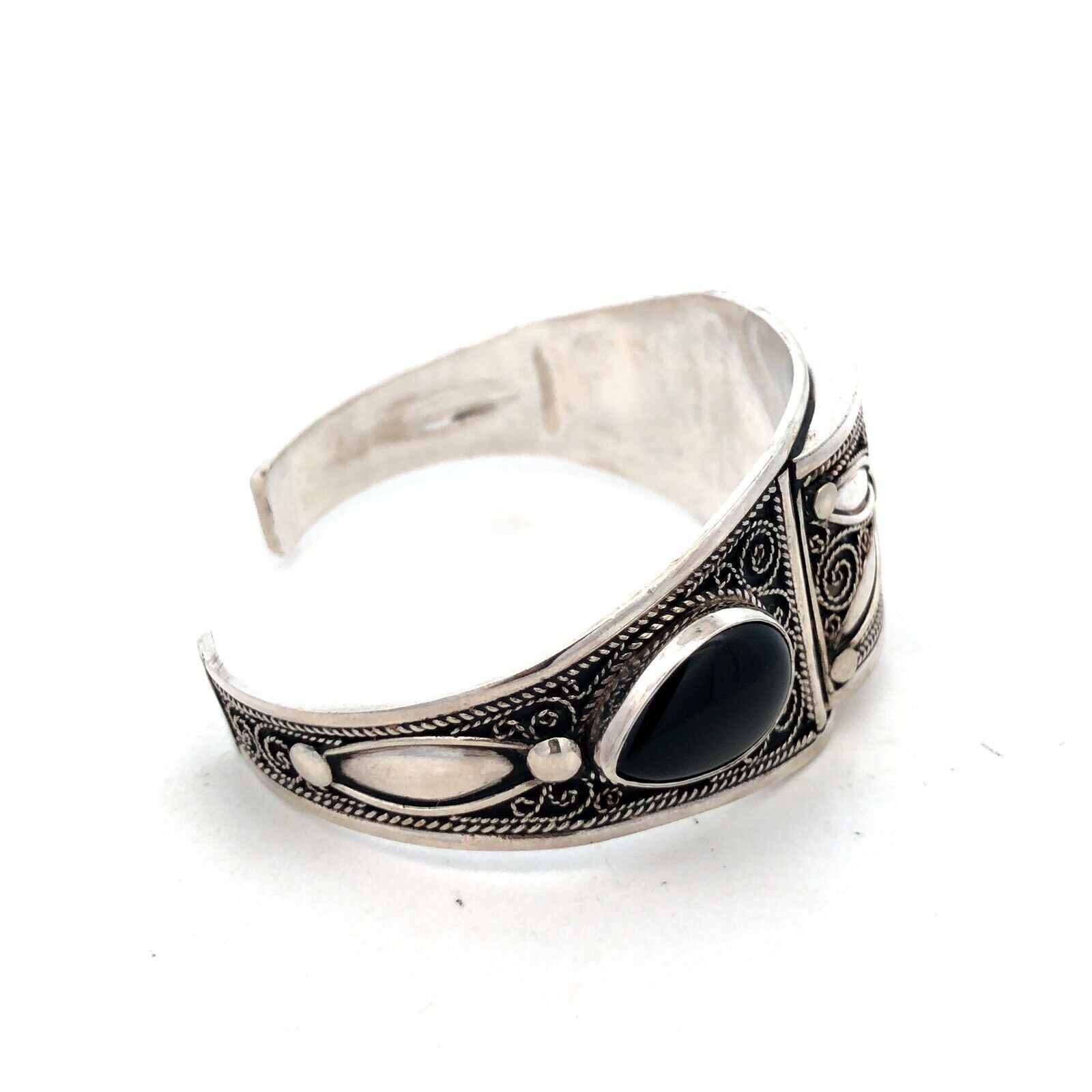 Vintage 925 Sterling Silver Black Onyx Filigree Swirl Open Cuff Bracelet