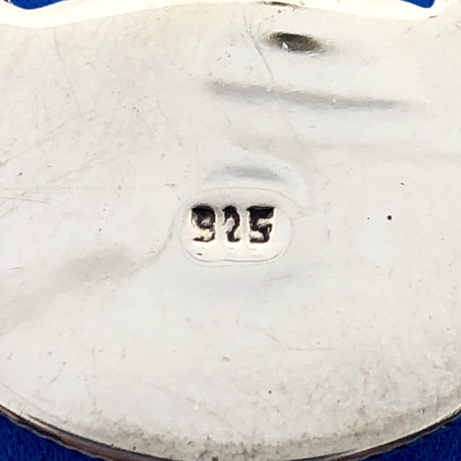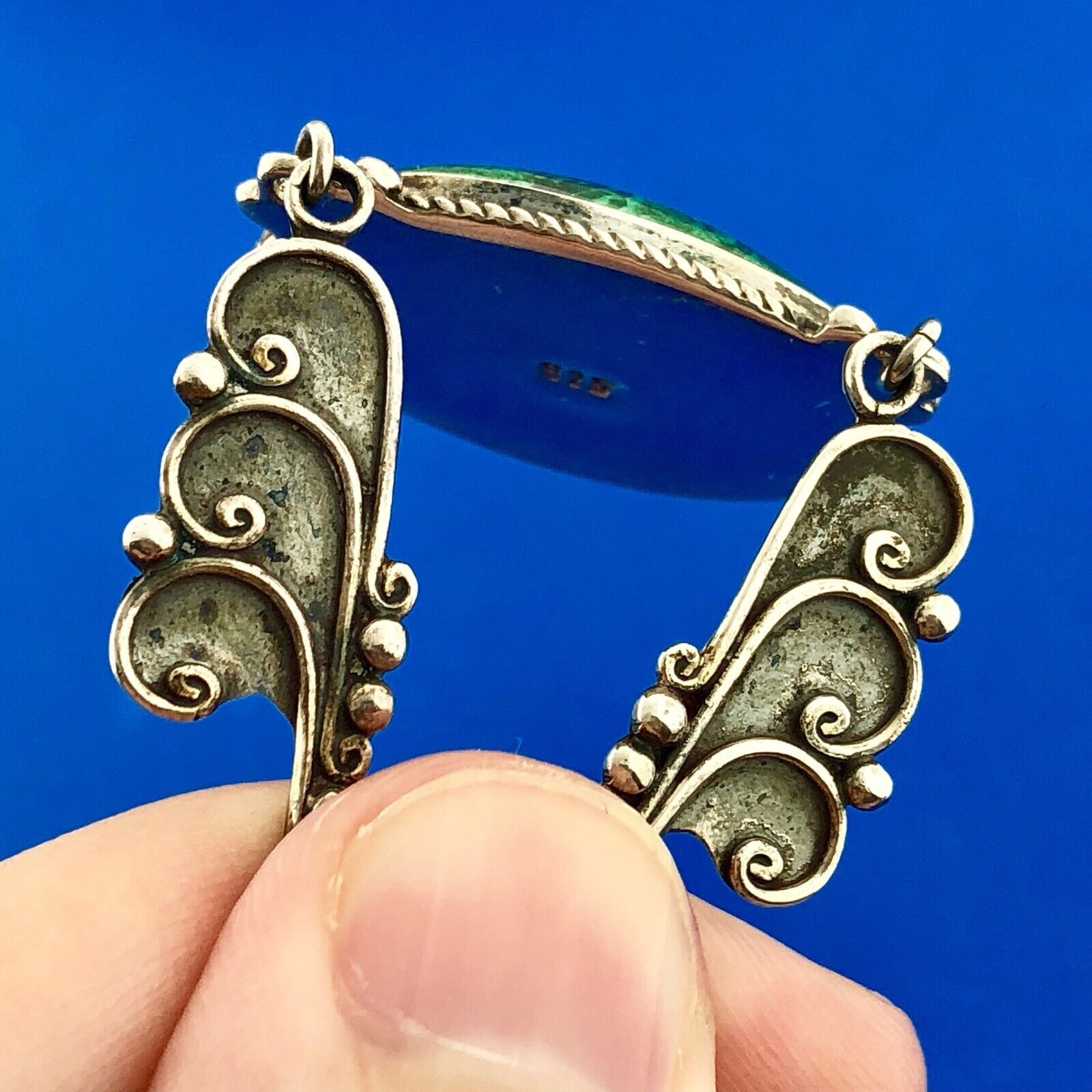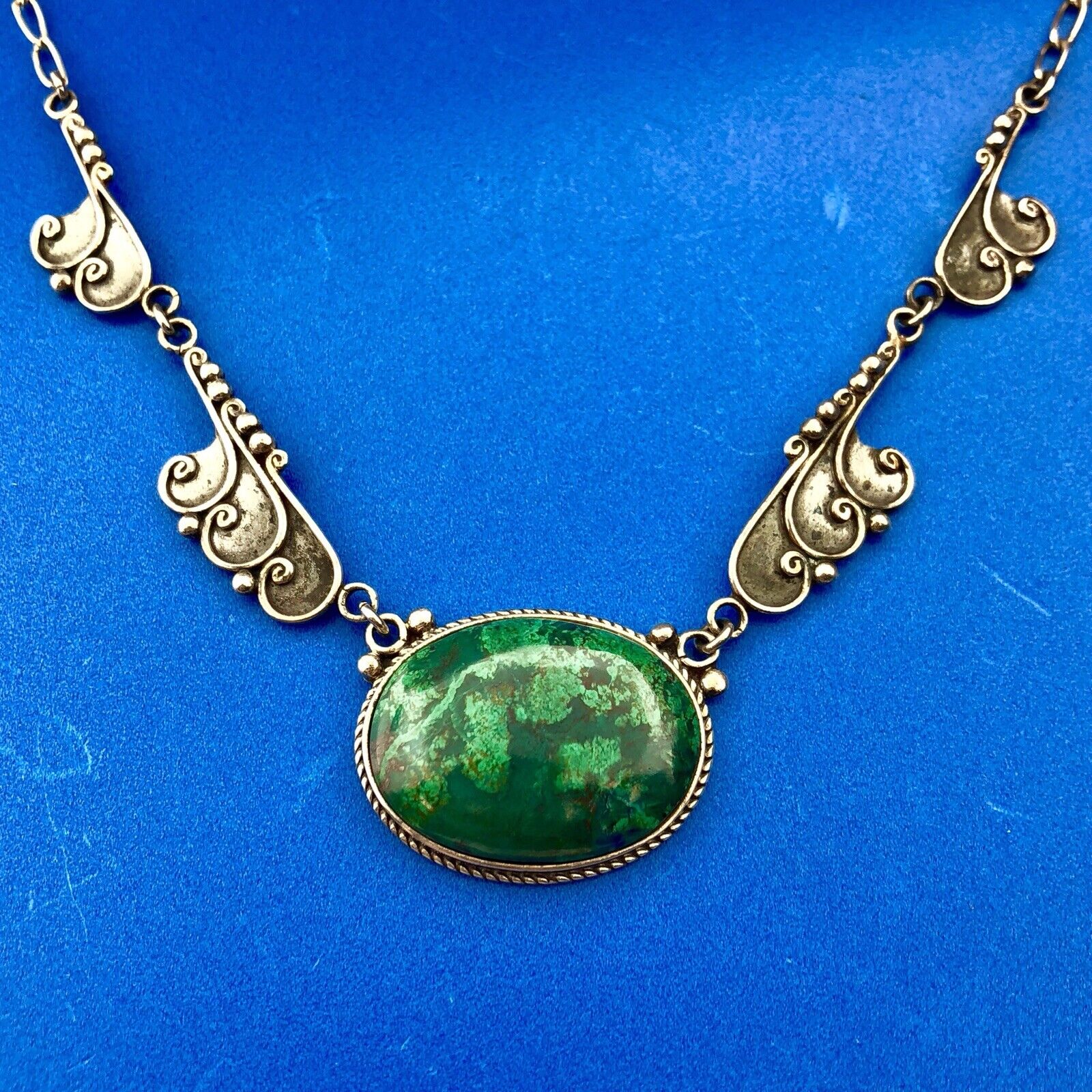 Vintage 925 Sterling Silver Dark Green Maw Sit Sit Oval Cabochon Scroll Necklace