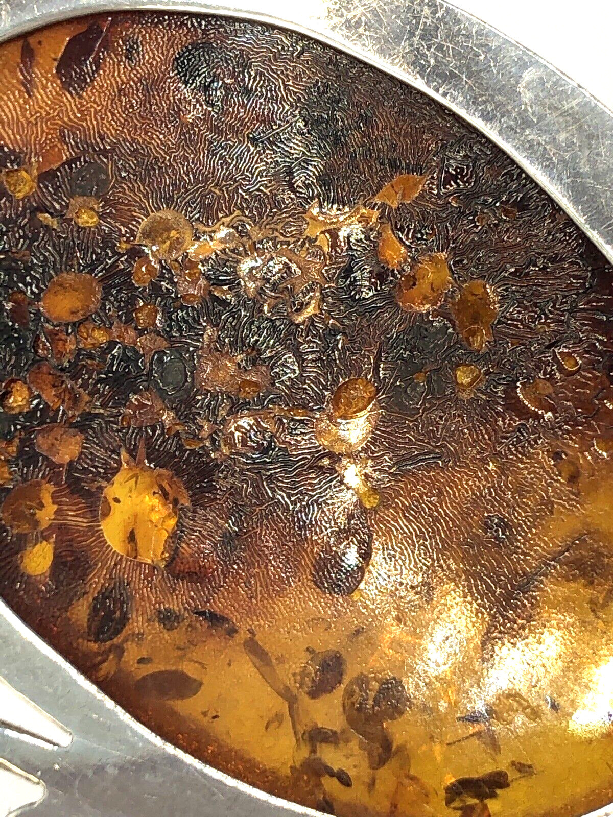 Vintage 925 Sterling Silver Oval Amber Open Scroll Statement Pendant