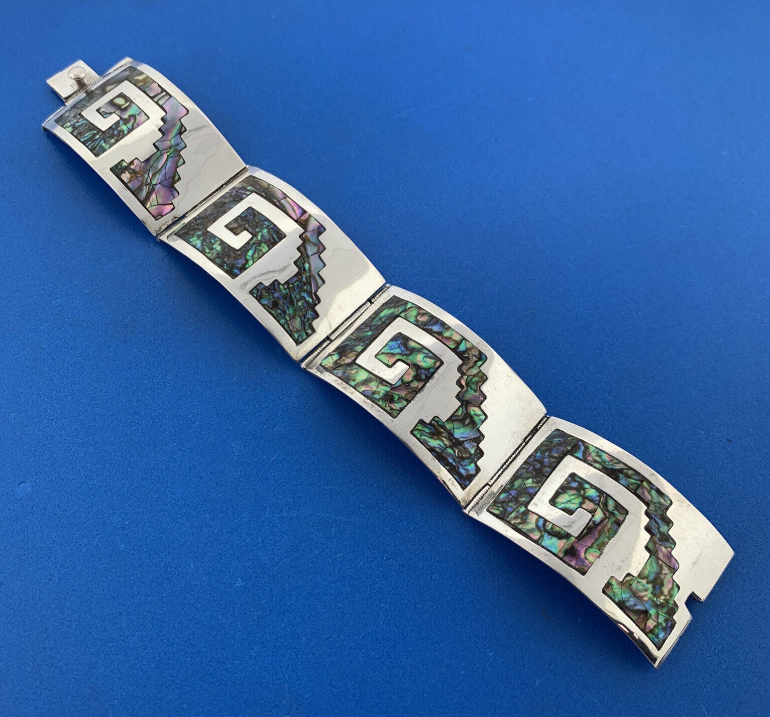 - Vintage Los Ballesteros Taxco 925 Sterling Silver Abalone Panel Cuff Bracelet