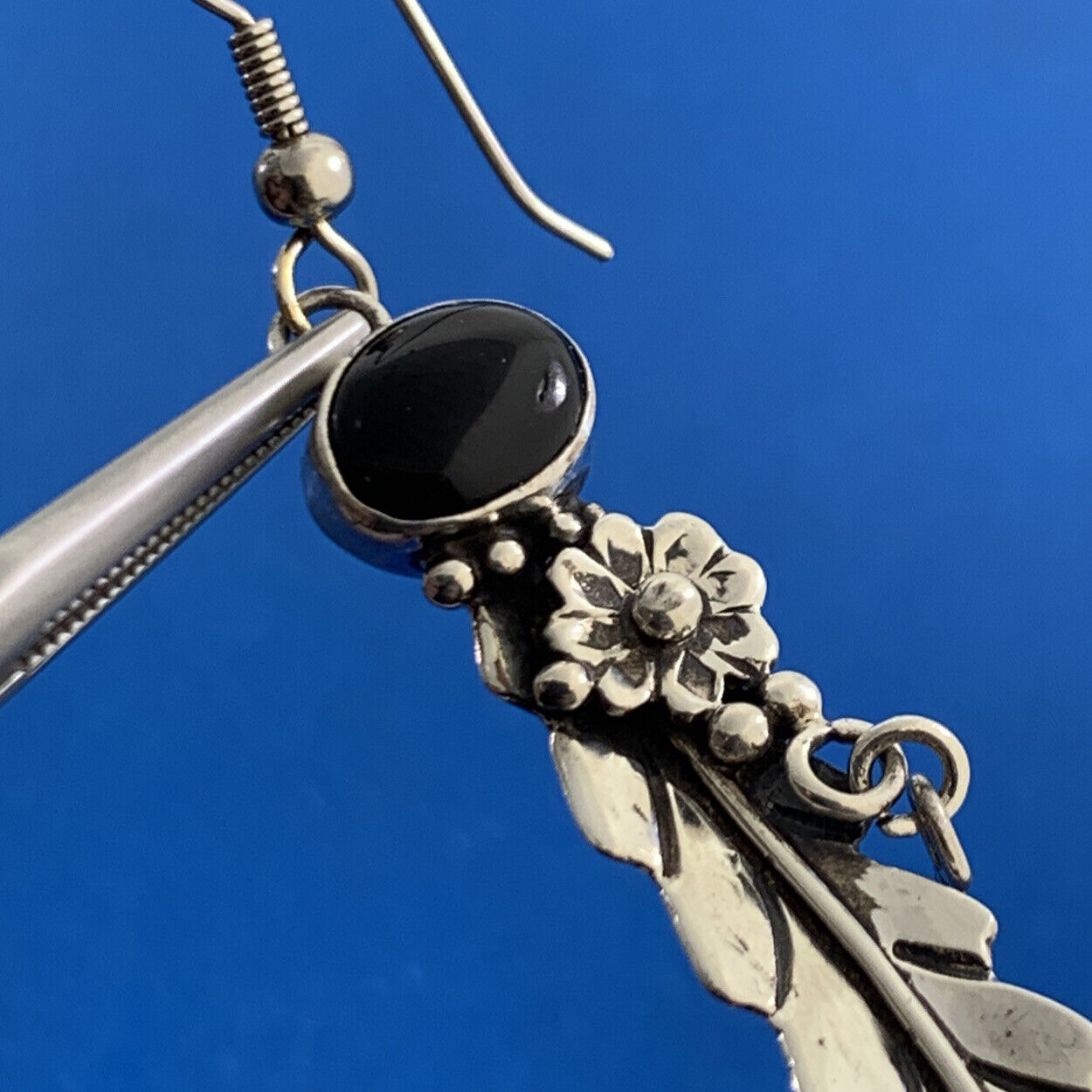 - Vintage Native American 925 Sterling Silver Black Onyx Dangle Feather Earrings